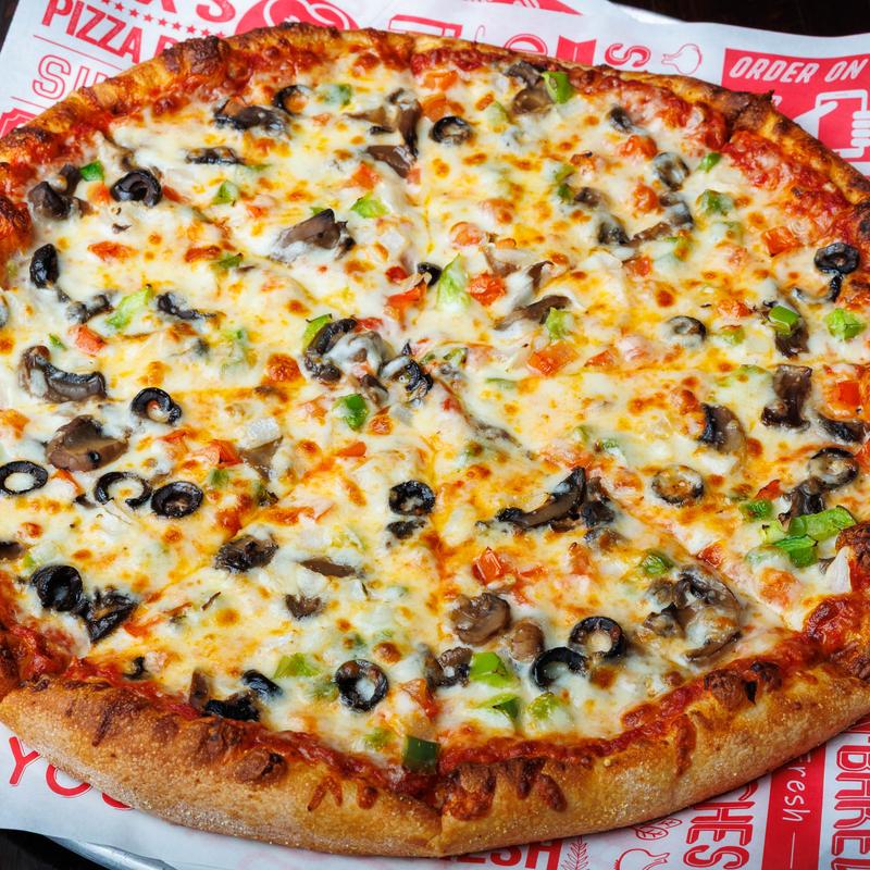 Our delicious sauce, cheese, pepperoni, sausage, mushrooms, green peppers, and onions.