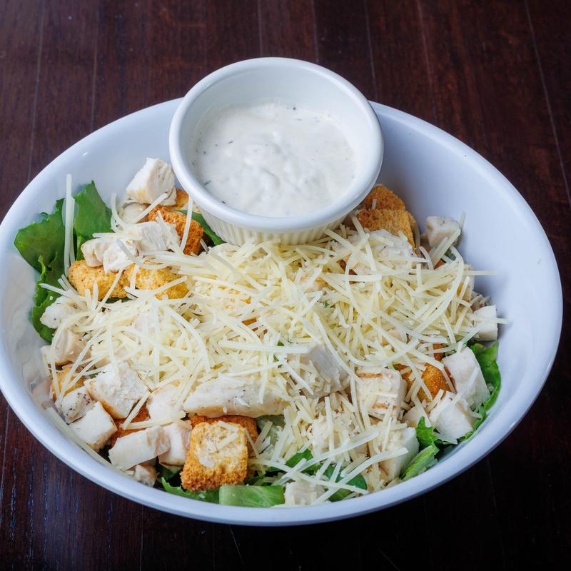 Grilled chicken, romaine lettuce, and croutons dressed with parmesan cheese.