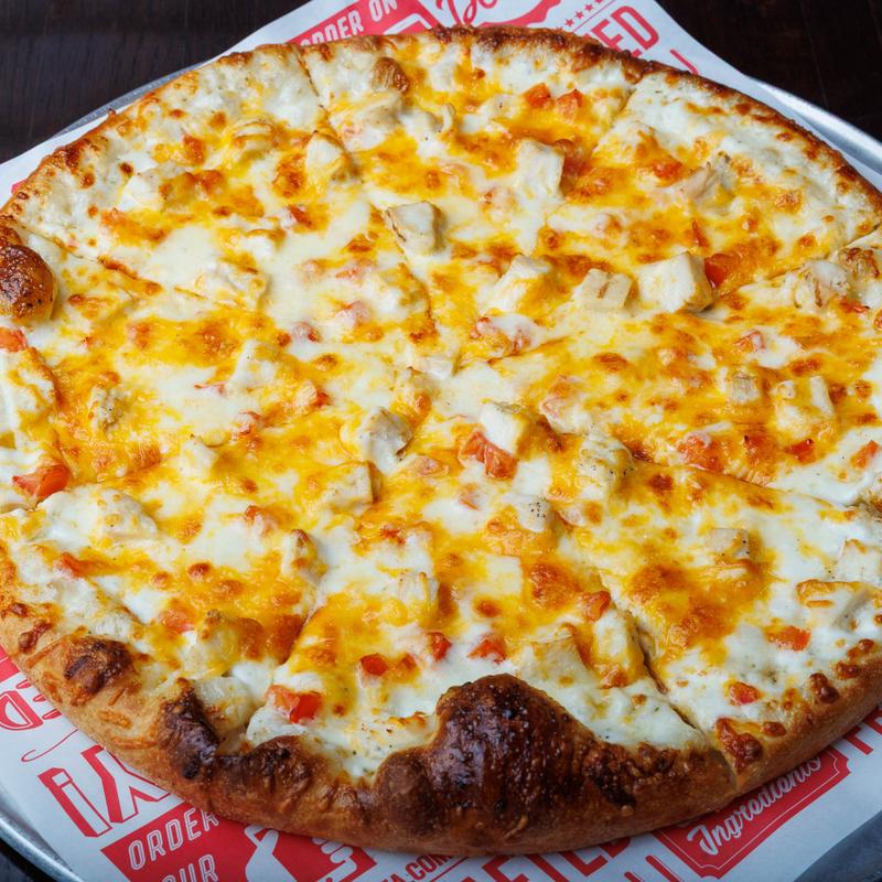 Diced chicken, tomatoes & ranch dressing with mozzarella, provolone & cheddar cheese.